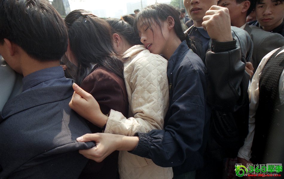 2001年春运期间,一名女子在购票的队伍中精疲力尽。