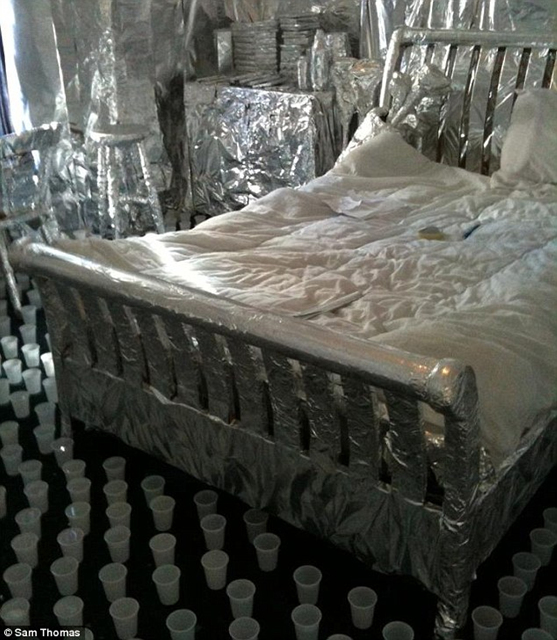 据报道,这名学生名叫杰克(Jake Walker),他在离开宿舍之前是锁了门的。但一周后当他回来时,发现自己的舍友用锡纸包裹了屋内所有的东西,包括他的冲浪板以及曲棍球棒。此外,恶作剧者还在地板上放了几百只杯子,让卧室看起来更像是奇怪的月球地表,而非一个学生睡觉的地方。
