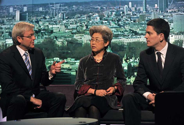 2009年3月29日,英国伦敦,澳大利亚总理陆克文,中国驻英大使傅莹和英国外交大臣米利班德参加了BBC电视中心的“安德鲁-玛尔脱口秀”栏目。