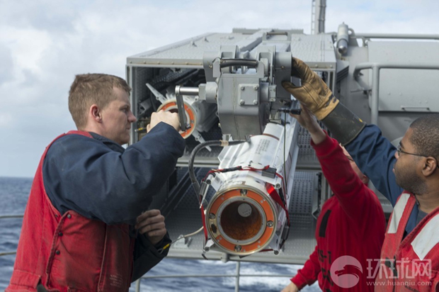 艾森豪威尔号航母上的士兵给一具海麻雀近防导弹系统填装弹药