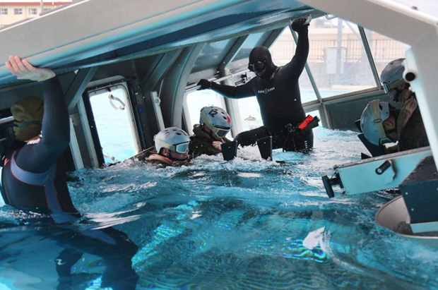 2011年“3·11”日本大地震发生后,这些队员们第一时间走进灾区,参加震灾救援活动,体现出美日两国“跨越障碍的友情”。不过,由于不断曝出强奸以及擅闯民宅等丑闻,这支队伍近期受到了日本民众的冷眼。图为坠海飞机救援训练。