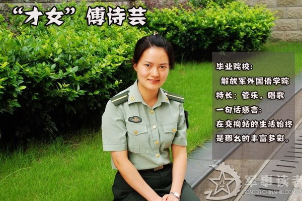 “才女”傅诗芸。傅诗芸是一个从名字里就透露着“才气”的女孩儿。唱歌、跳舞、乐器 傅诗芸都样样精通。然而这位才女起初对于交换站的生活却有点不太适应。初来交换站,傅诗芸感到和在学校大不一样,每天无论是上机房还是开饭都要集合站队, 这让傅诗芸很不适应,不像在学校里那么自由自在。在机房跟班值勤时傅诗芸也感到原来通信工作是那么的枯燥乏味,而且在机房的秩序还必须那么正规。让傅诗芸 印象最深刻的还要数在交换站第一次参加紧急集合。当时毫无准备的她不仅最后一个下楼,还带错了装具,这让傅诗芸感到非常丢人,同时也找到了自己的差距。之 后傅诗芸开始努力地适应连队生活,不断的改掉自己从前一些娇气的坏毛病,我们发现这个女孩已经慢慢地融入到连队生活中了。八一晚会,傅诗芸还利用自己的特 长,为晚会节目《丰碑》制作了视频,这让许多官兵都刮目相看,大家都说才女不愧是才女。