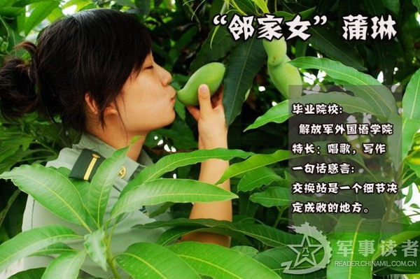 “邻家女”蒲琳。爱好唱歌和写作的蒲琳看上去总会给人一种邻家女孩的感觉。蒲琳说在交换站当兵锻炼期间自己找到了许多差距,首先是找到了学校与基层部队的 差距,到了连队才知道什么才是真正的当兵生活,同时还找到了当学员与当兵的差距,现在才知道要当好一名合格兵不容易。此外自己还经历了很多第一次:第一次 登台演出,第一次写新闻稿,第一次当队列指挥等等。让蒲琳感触最深的还要属八一晚会的舞台布置了,在接到任务后,蒲琳与其他几名学员一起奋战了两天两夜, 终于圆满完成了会场布置任务。在看到自己通过艰辛劳动换来的成果时,蒲琳终于第一次有了这么大的成就感,这也是她当兵锻炼最大的收获。